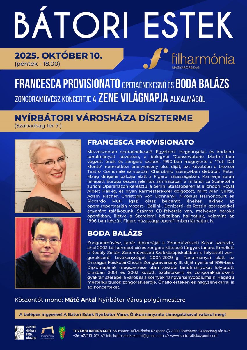 Új évaddal jelentkezik a Bátori estek komolyzenei koncertsorozat. A Városháza dísztermében október 10-én 18 órától Francesca Provisionato operaénekesnő és Boda Balázs zongoraművész koncertjét hallgathatjuk meg a zene világnapja alkalmából.