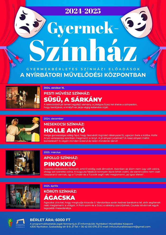 A 2024-2025-ös gyermekszínházi évadunk előadásai a plakáton találhatók.
