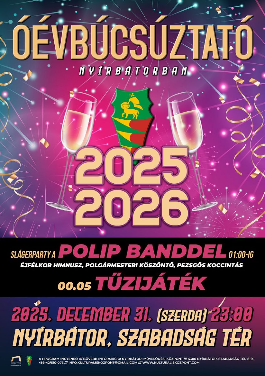 Slágerparty a Polip Banddel, tánc, pezsgőzés, koccintás. A nyírbátori Szabadság téren minden adott lesz, ami egy jó szilveszteri bulihoz szükséges. Köszöntsük együtt az Újévet!