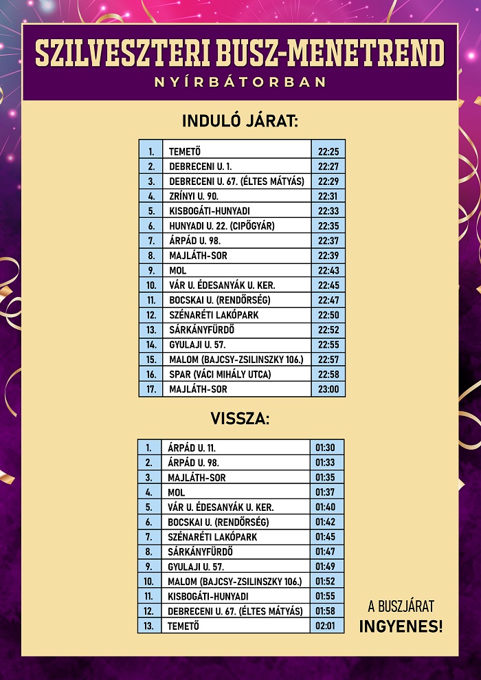 Az éjszaka folyamán ingyenes buszjárat segíti a városlakók közlekedését.