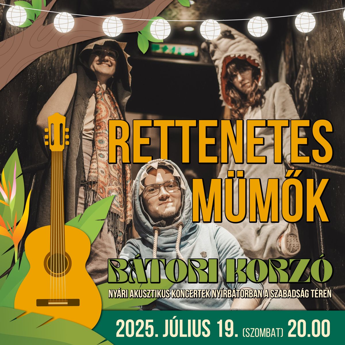 Ezen az estén a Rettenetes Mümők testvértrió és Juhász Marci szóló formációja fogja szolgáltatni a kellemes nyáresti hangulatot a Bátori Korzón.