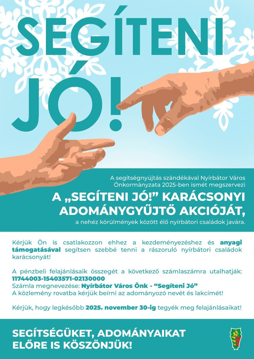A segítségnyújtás szándékával Nyírbátor Város Önkormányzata 2025-ben ismét megszervezi a "Segíteni jó!" karácsonyi adománygyűjtő akcióját a nehéz körülmények között élő nyírbátori családok javára.