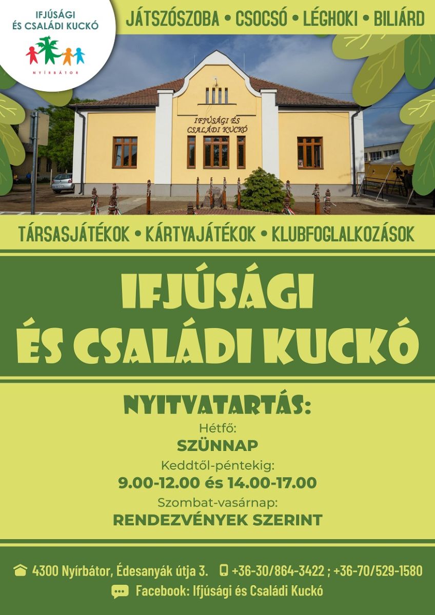 Ifjúsági és Családi Kuckó (4300 Nyírbátor, Édesanyák útja 3.): 2017. április 15-én nyitotta meg kapuit ez a jól felszerelt közösségi tér, amely gyermekek, fiatalok, kisgyermekes családok részére biztosít lehetőséget szabadidejük hasznos eltöltésére. Különböző szervezett tematikus foglalkozások, rendezvények színesítik a kínálatot, valamint a terembérleti lehetőség is népszerű.